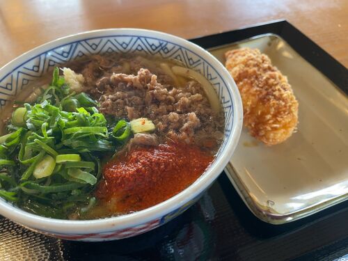 お昼に伺いました。 福山市曙町のどんどんさん 外観 いつもの外観を眺めて入店します。 メニュー 一応メニューを見ますが いつも一択です。 ◆肉うどん 並 470円(税込) を、オーダー うどんを受け取り、お会計を済ませて席に着きます。 うどん ここにね…