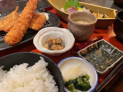 夜に伺いました。 福山市東川口町の阿も珍さん 外観 待ちはありません 入店します。 メニュー 定食類の中から ◆ミックスフライ定食 1,880円(税込) を、オーダー 卓上 小さな器に入ったイカの塩辛 以前は食べ放題の塩辛 今は少しのサービスです。 瓶ビール …
