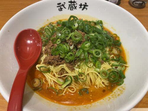 お昼に伺いました。 広島市西区横川町の武蔵坊さん 外観 インパクトのある外観です。 緑色ののれんをくぐって入ります。 券売機 入店してすぐの券売機で食感を選びます。 ◆汁なし担担麺 濃厚胡麻 700円(税込) ◆麺大盛 100円(衛込) の食券を買いま…