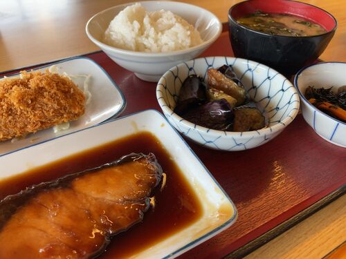 お昼に伺いました。 福山市東深津町の深津食堂さん 外観 大きな白い暖簾をくぐります。 陳列してある好きなおかずをとって着席 ご飯 ここに来たらいつも取りすぎてしまいます。 ブリの照り焼き クリームコロッケ ナスの揚げ浸し ひじき ご飯 お味噌汁 ブリの…